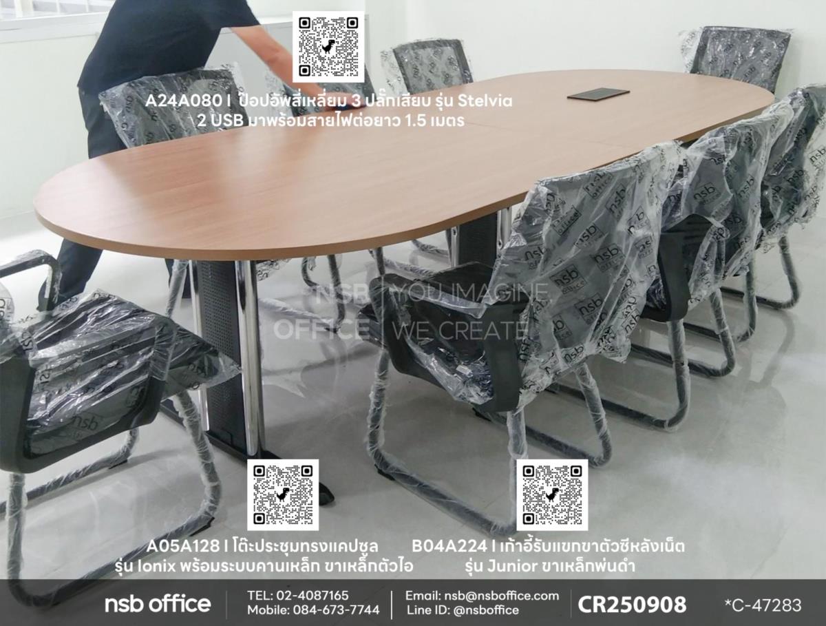 โต๊ะประชุมทรงแคปซูลรุ่น Ionix (โลนิกซ์) รหัสสินค้า A05A128 เสริมป๊อปอัพรุ่น Stelvia (สเตลเวีย) รหัสสินค้า A24A080 ที่ช่วยให้คุณสามารถเชื่อมต่ออุปกรณ์ต่าง ๆ ได้อย่างสะดวกสบาย ไม่ว่าจะเป็นการชาร์จไฟหรือการเชื่อมต่อกับอุปกรณ์สื่อสารต่าง ๆ นอกจากนี้ยังมีพื้นที่กว้างขวางที่สามารถรองรับการประชุมได้หลายคนในเวลาเดียวกัน เสริมเก้าอี้รับแขกขาตัวซีรุ่น Junior (จูเนียร์) รหัสสินค้า B04A224 มีการออกแบบที่เน้นความสบายและความสวยงาม ด้วยวัสดุที่มีคุณภาพและการออกแบบที่ทันสมัย ทำให้เหมาะสำหรับการใช้งานในสำนักงานหรือพื้นที่ประชุมต่างๆค่ะ