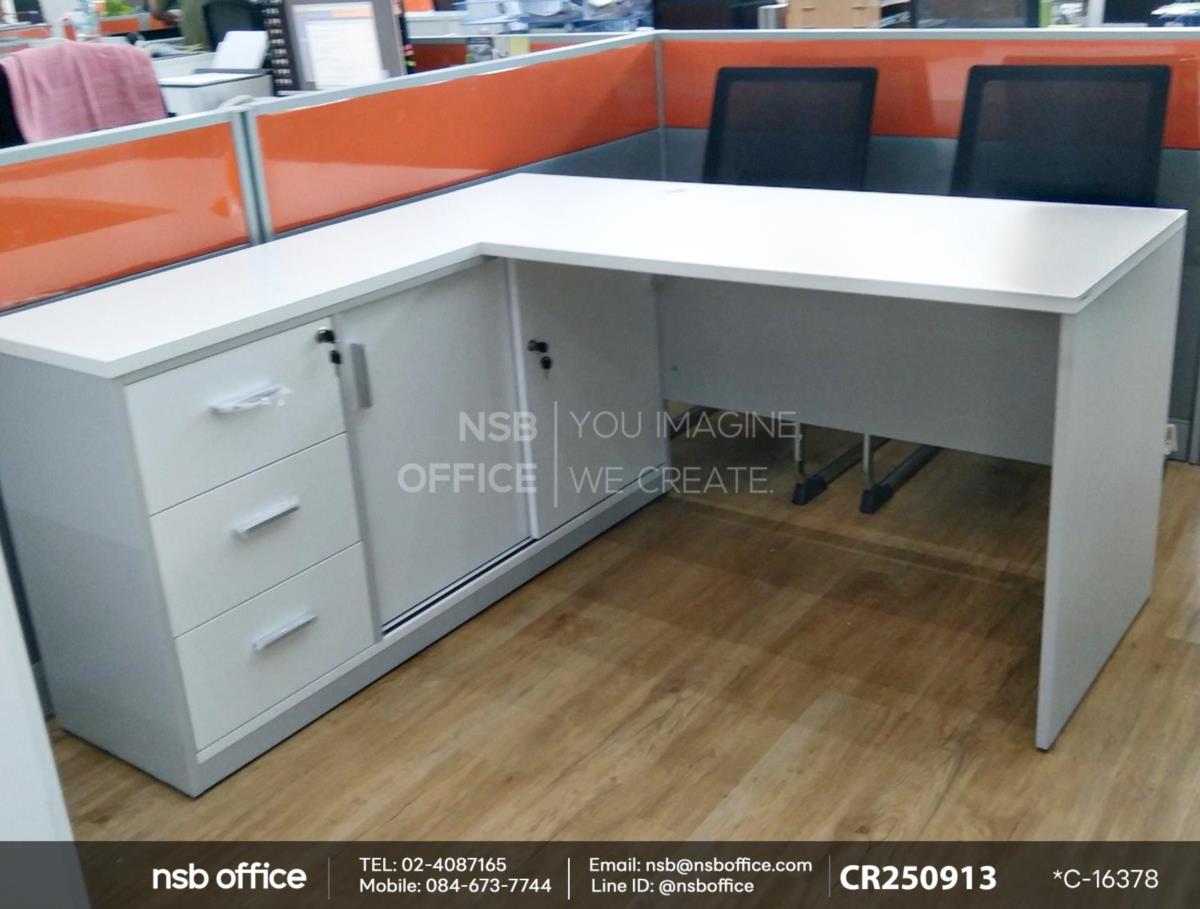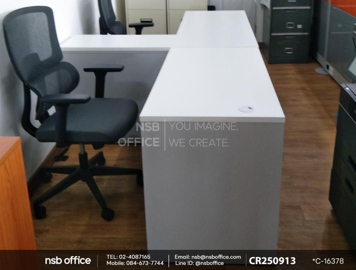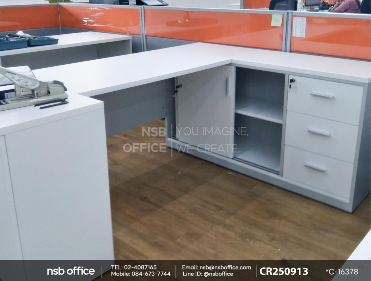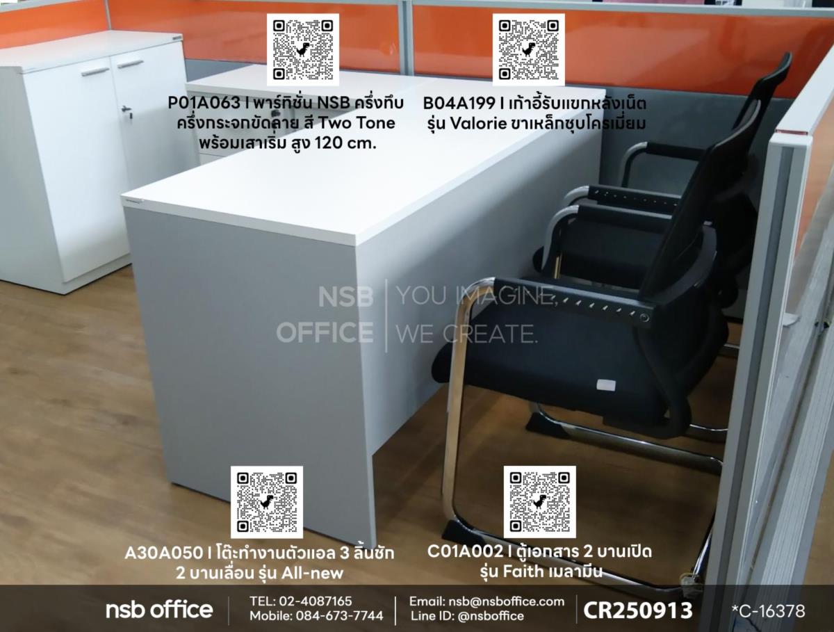 หน้างานนี้เป็นโซนสำนักงานลูกค้าได้เลือกซื้อโต๊ะทำงานตัวแอล 3 ลิ้นชัก 2 บานเลื่อน รุ่น All-new (ออนิว) รหัสสินค้า A30A050 เสริมการใช้งานด้วยเก้าอี้รับแขกหลังเน็ต รุ่น Valorie (วาลอรี่) รหัสสินค้า B04A199 แล้วกั้นเสริมเพิ่มความเป็นส่วนตัวด้วยพาร์ทิชั่น NSB ครึ่งทึบครึ่งกระจกขัดลาย สี Two Tone รหัสสินค้า P01A063 ค่ะ