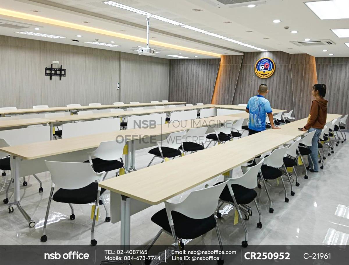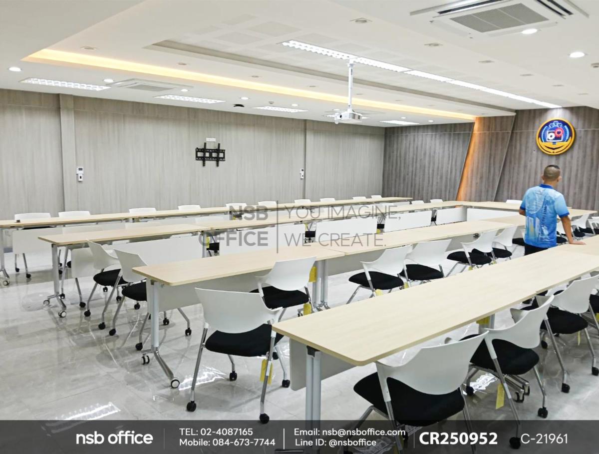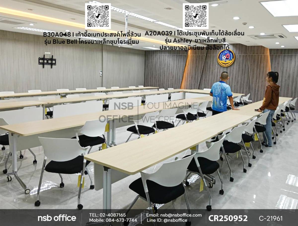 เพื่อความสะดวกสบายในการประชุม เราขอแนะนำเก้าอี้อเนกประสงค์โพลี่รุ่น Blue Bell (บลู เบล) รหัสสินค้า B30A048 เลือกแบบหุ้มเบาะ ที่มีโครงขาเหล็กชุบโครเมี่ยม แข็งแรง ทนทาน และมีดีไซน์ที่เข้ากันได้อย่างลงตัวกับโต๊ะประชุมพับเก็บได้ล้อเลื่อน รุ่น Ashley (แอชลีย์) รหัสสินค้า A20A039 บังตาไม้สีขาว หน้า Top เมลามีนสีเมเปิ้ล สามารถพับเก็บได้เมื่อไม่ใช้งาน ช่วยให้พื้นที่ของคุณดูเรียบร้อยและเป็นระเบียบค่ะ