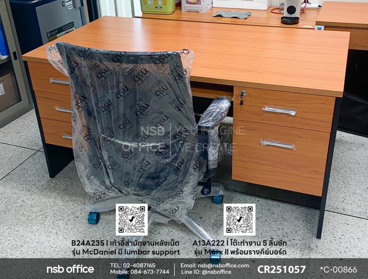 หน้างานนี้เป็นโซนสำนักงาน ลูกค้าได้เลือกซื้อโต๊ะทำงาน 5 ลิ้นชัก รุ่น Marx ll (มากซ์ 2) รหัสสินค้า A13A222 ขนาด 150W*80D cm รุ่นนี้จะมาพร้อมกับรางคีย์บอร์ด สีที่เลือกใช้เป็นสีเชอร์รี่ดำ ใช้งานคู่กันกับเก้าอี้สำนักงานหลังเน็ต รุ่น McDaniel (แม็กแดเนียล) รหัสสินค้า B24A235 มี lumbar support รองรับแผ่นหลัง ช่วยให้สามารถนั่งทำงานได้สะดวกสบาย ไม่เมื่อยล้าระหว่างวันค่ะ