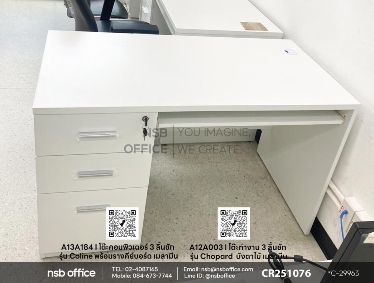 หากคุณกำลังมองหาโต๊ะคอมพิวเตอร์ที่ตอบโจทย์การทำงานและการเรียน โต๊ะคอมพิวเตอร์ 3 ลิ้นชักรุ่น Coline (คอลินน์) รหัสสินค้า A13A184 และ โต๊ะทำงาน 3 ลิ้นชัก รุ่น Chopard (โชพาร์ด) รหัสสินค้า A30A073 เหมาะกับทุกพื้นที่ ไม่ว่าจะเป็นบ้านหรือสำนักงาน ลิ้นชัก 3 ช่องช่วยให้คุณจัดเก็บอุปกรณ์ต่างๆ ได้อย่างเป็นระเบียบ ผลิตจากเมลามีนที่มีความทนทานและง่ายต่อการดูแลรักษาค่ะ