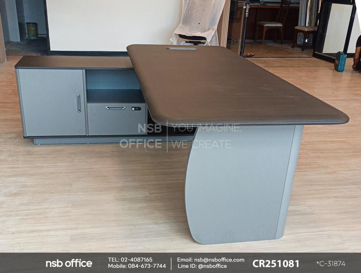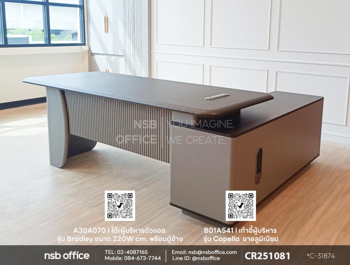 หน้างานนี้เป็นโซนห้องผู้บริหาร ลูกค้าได้เลือกซื้อโต๊ะผู้บริหารตัวแอล รุ่น Bradley (แบรดลีย์) รหัสสินค้า A30A070 รุ่นนี้จะมาพร้อมกับตู้ข้าง ใช้งานคู่กับเก้าอี้ผู้บริหารรุ่น Capella (คาเพลล่า) รหัสสินค้า B01A541 ที่ออกแบบมาเพื่อรองรับการนั่งทำงานในระยะยาว ช่วยให้คุณมีสมาธิและประสิทธิภาพในการทำงานสูงสุดค่ะ