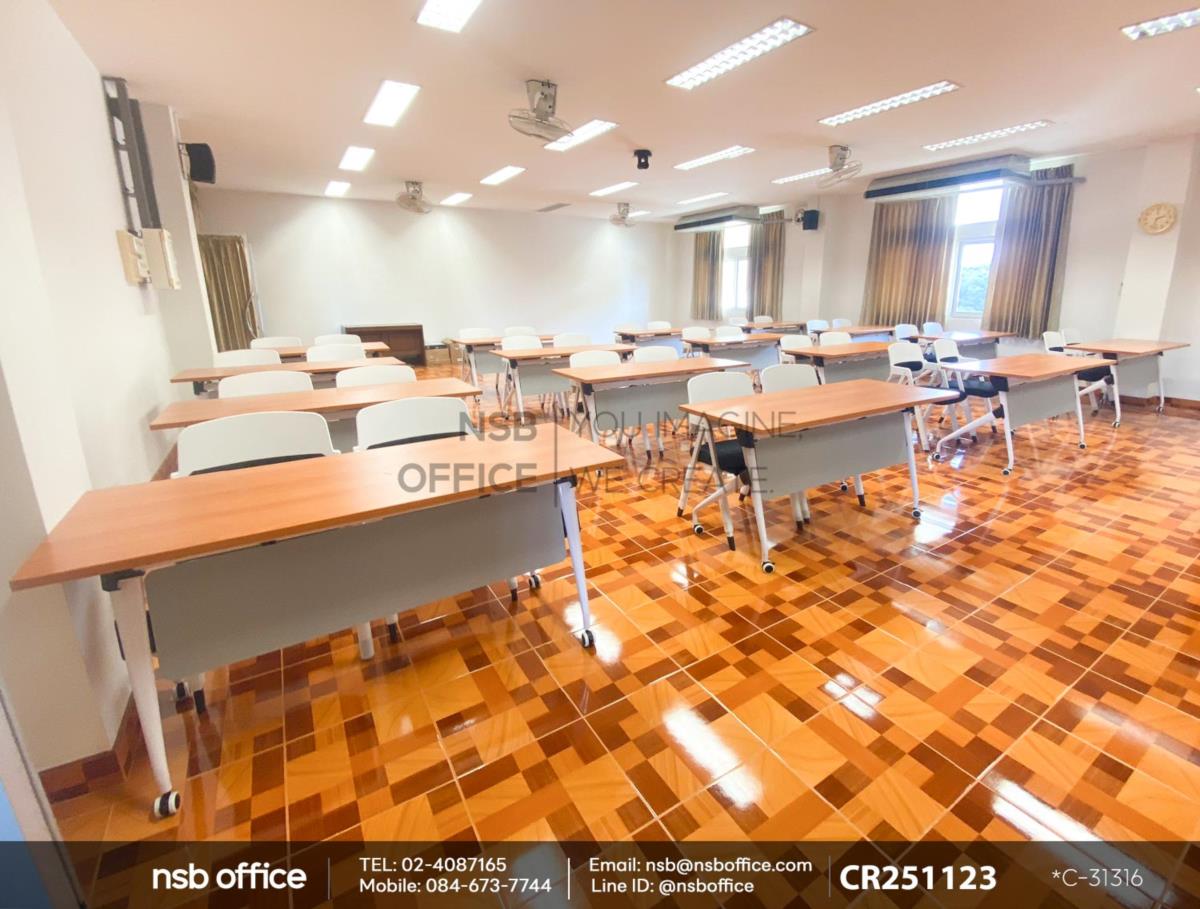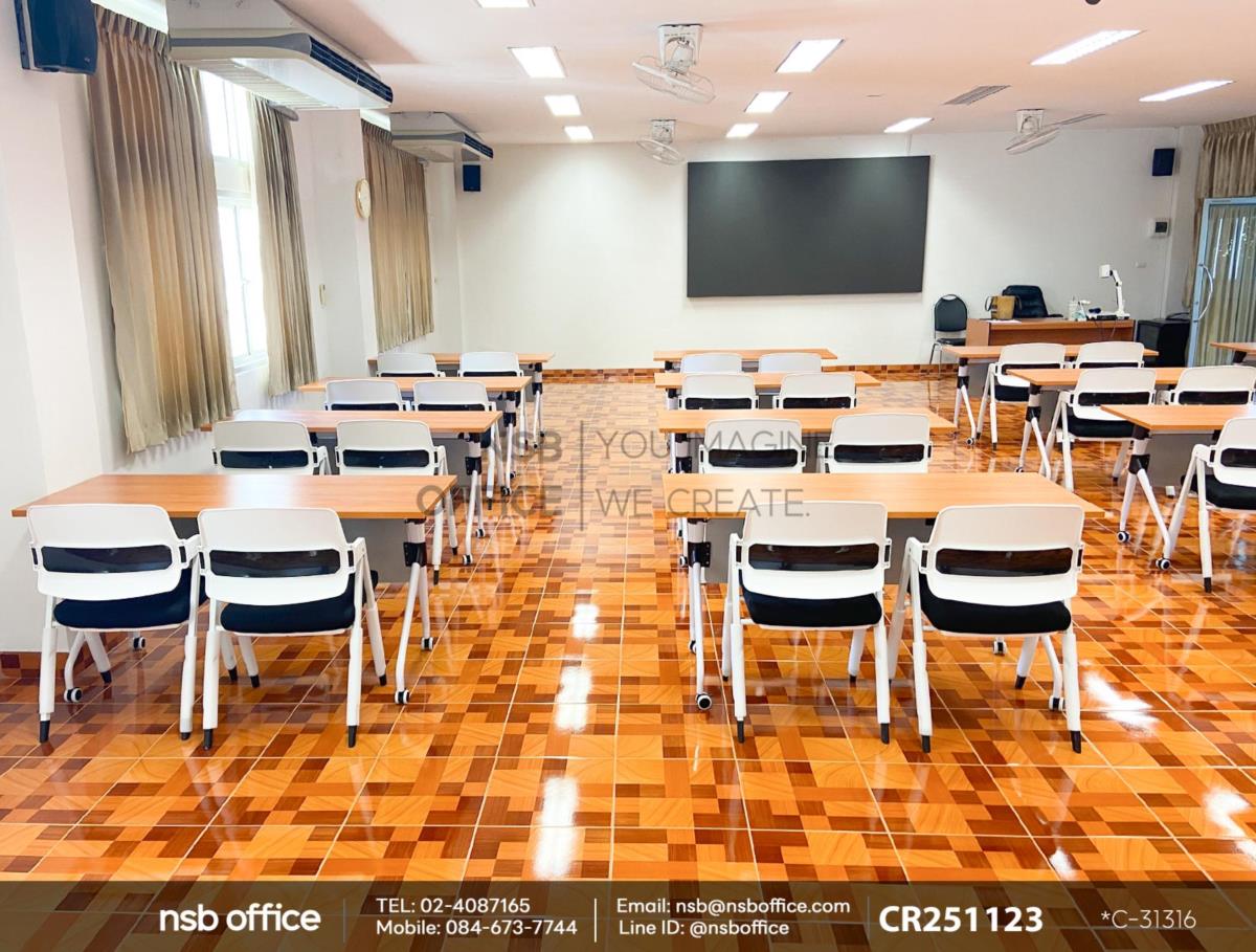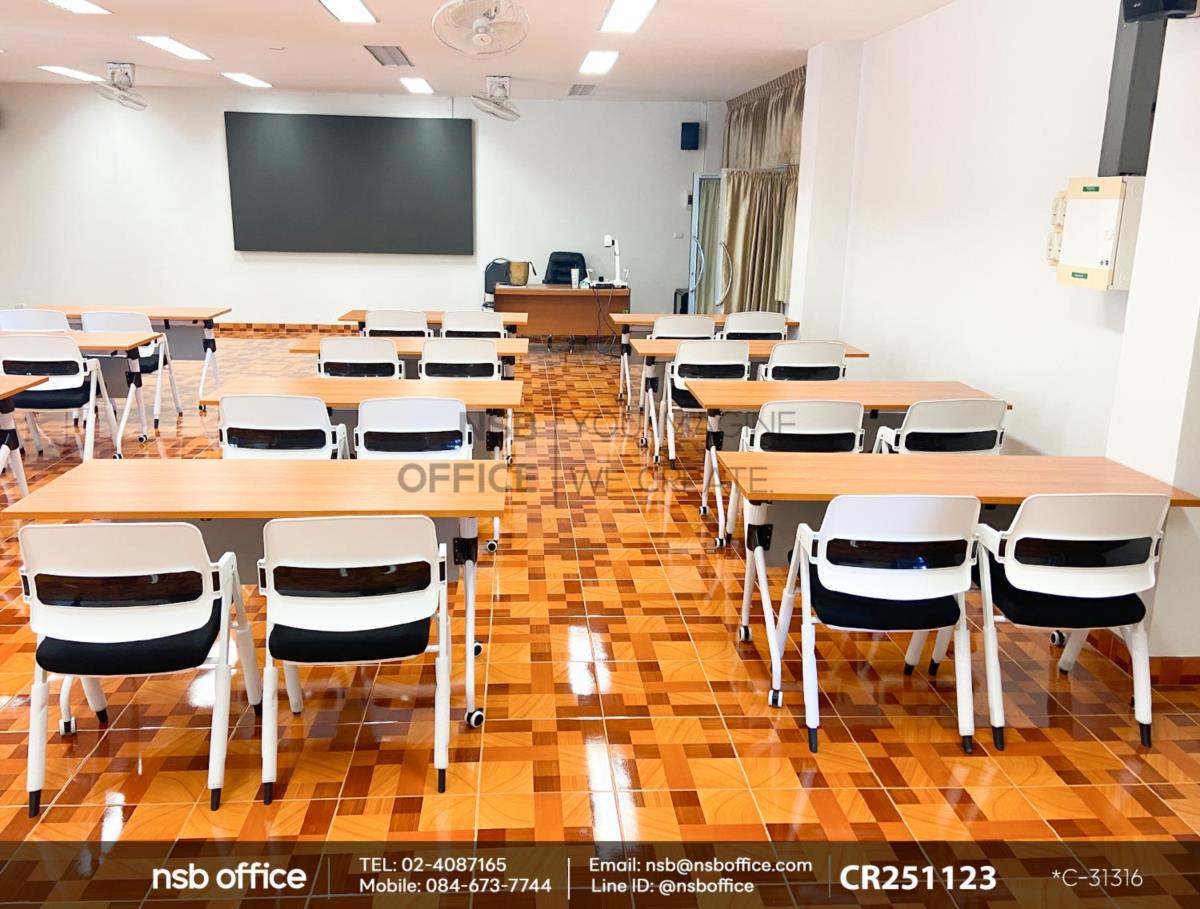 โซนนี้เป็นโซนห้องเรียน ห้องอบรม ลูกค้าได้เลือกซื้อโต๊ะประชุมพับได้ล้อเลื่อน รุ่น Wellington (เวลลิงตัน) รหัสสินค้า A18A104 รุ่นนี้สามารถพับได้เมื่อไม่ต้องการใช้งาน มาพร้อมกับล้อเลื่อนที่ช่วยให้การเคลื่อนย้ายเป็นเรื่องง่าย ไม่ว่าจะเป็นการจัดเรียงโต๊ะในห้องประชุมหรือการเก็บรักษา เสริมการใช้งานด้วยเก้าอี้อเนกประสงค์เฟรมโพลี่ รุ่น Nicole (นิโคล) รหัสสินค้า B05A206 ค่ะ