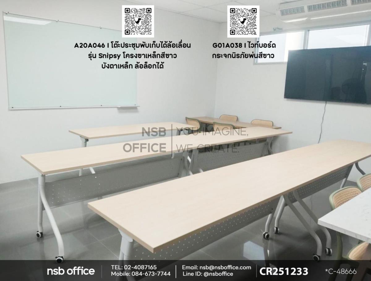 เพิ่มประสิทธิภาพในการประชุมของคุณด้วยโต๊ะประชุมพับเก็บได้รุ่น Snipsy (สนิปซี่) รหัสสินค้า A20A046 ที่มาพร้อมกับล้อเลื่อน ทำให้การจัดการพื้นที่ทำงานของคุณเป็นเรื่องง่ายและสะดวกสบาย โต๊ะนี้ออกแบบมาเพื่อให้คุณสามารถปรับเปลี่ยนรูปแบบการใช้งานได้ตามต้องการ ไม่ว่าจะเป็นการประชุมขนาดเล็กหรือใหญ่ ก็สามารถตอบโจทย์ได้อย่างลงตัว เสริมการใช้งานด้วยไวท์บอร์ดกระจกนิรภัยพ่นสีขาว รหัสสินค้า G01A038 ที่ช่วยให้คุณสามารถนำเสนอไอเดียและข้อมูลได้อย่างชัดเจนและมีสไตล์ค่ะ