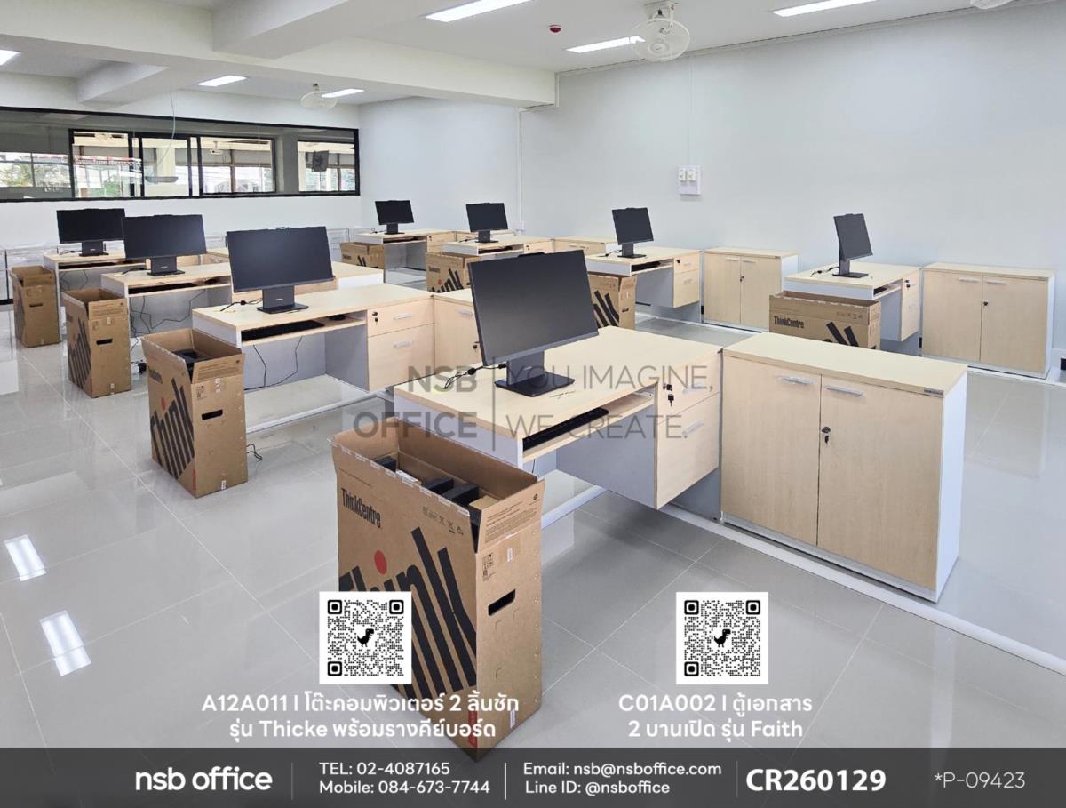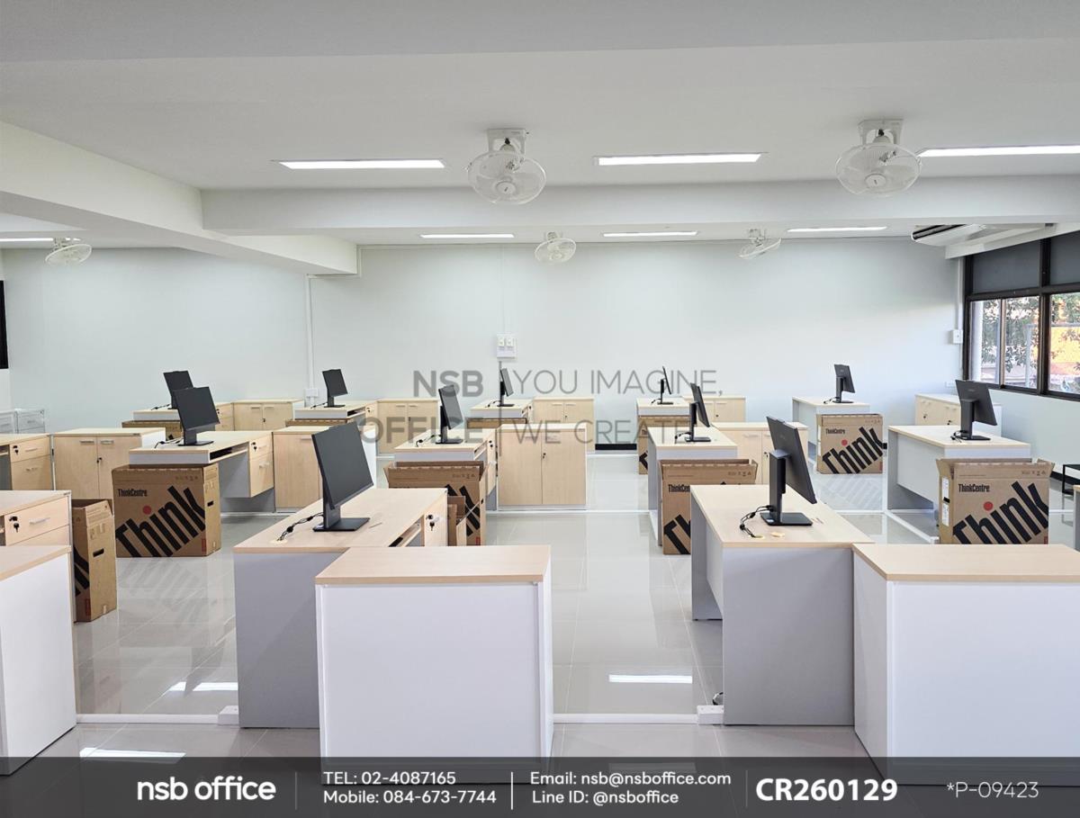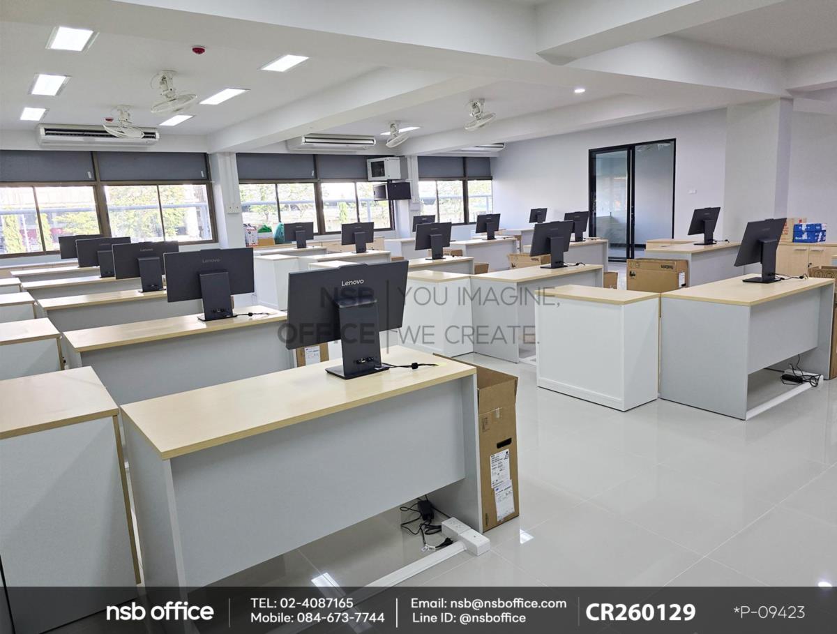 หน้างานนี้เป็นห้องเรียนสำหรับใช้คอมพิวเตอร์ ลูกค้าได้เลือกซื้อโต๊ะคอมพิวเตอร์ 2 ลิ้นชัก รุ่น Thicke (ธิก) รหัสสินค้า A12A011 สีเมเปิ้ลตัดเทาอ่อน โต๊ะรุ่นนี้จะมาพร้อมรางคีย์บอร์ด และตู้ลิ้นชัก 2 ลิ้นชัก เสริมการใช้งานด้วย ตู้เอกสาร รุ่น Faith (เฟธ) รหัสสินค้า C01A091 , รุ่น Freren (เฟรเรน) รหัสสินค้า C01A091 สีเมเปิ้ลตัดขาว ที่สามารถเก็บเอกสารสำคัญและอุปกรณ์สำนักงานได้อย่างมีประสิทธิภาพ ตู้เอกสารนี้ออกแบบมาให้เข้ากับโต๊ะคอมพิวเตอร์อย่างลงตัว ทำให้พื้นที่ทำงานของคุณดูเรียบร้อยและเป็นระเบียบมากขึ้นค่ะ