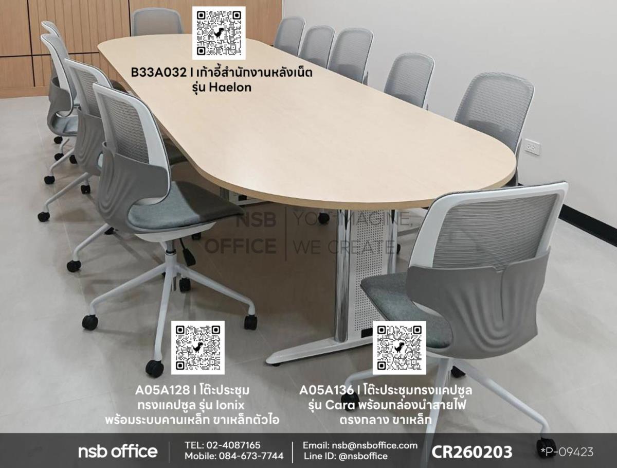 พบกับโต๊ะประชุมทรงแคปซูลรุ่น Ionix (โลนิกซ์) รหัสสินค้า A05A128 และรุ่น Cara (คาร่า) รหัสสินค้า A05A136 ที่ออกแบบมาเพื่อเสริมสร้างประสิทธิภาพในการทำงานของคุณ ด้วยดีไซน์ที่ทันสมัยและฟังก์ชันการใช้งานที่หลากหลาย โต๊ะประชุมนี้ไม่เพียงแต่สวยงาม แต่ยังช่วยให้การประชุมของคุณมีความเป็นระเบียบและมีสมาธิมากยิ่งขึ้นเสริมการใช้งานด้วยเก้าอี้สำนักงานหลังเน็ต รุ่น Haelon (เฮลอน) รหัสสินค้า B33A032 เพื่อให้การประชุมของคุณสะดวกสบายยิ่งขึ้น เก้าอี้นี้มีความยืดหยุ่นและระบายอากาศได้ดี ทำให้เหมาะสำหรับการประชุมที่ยาวนานมากๆค่ะ