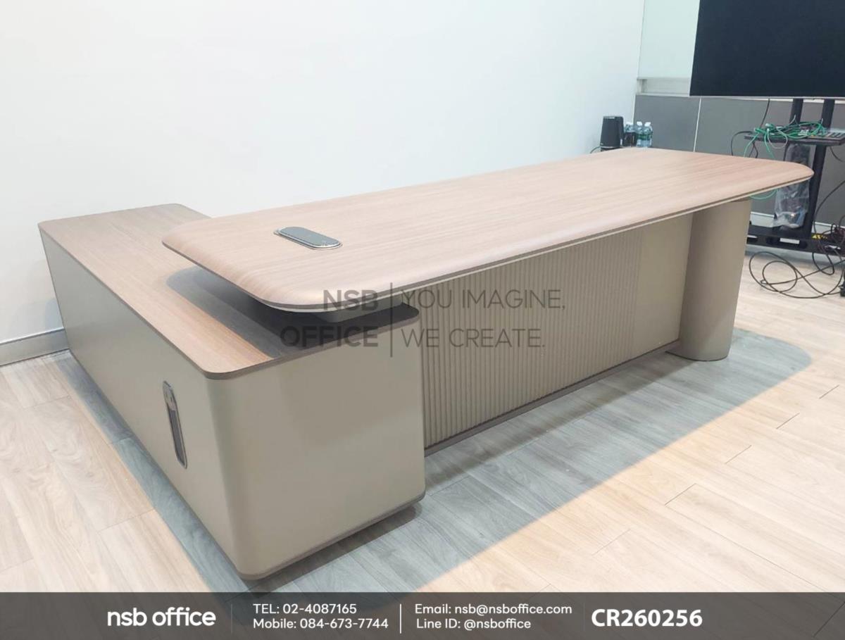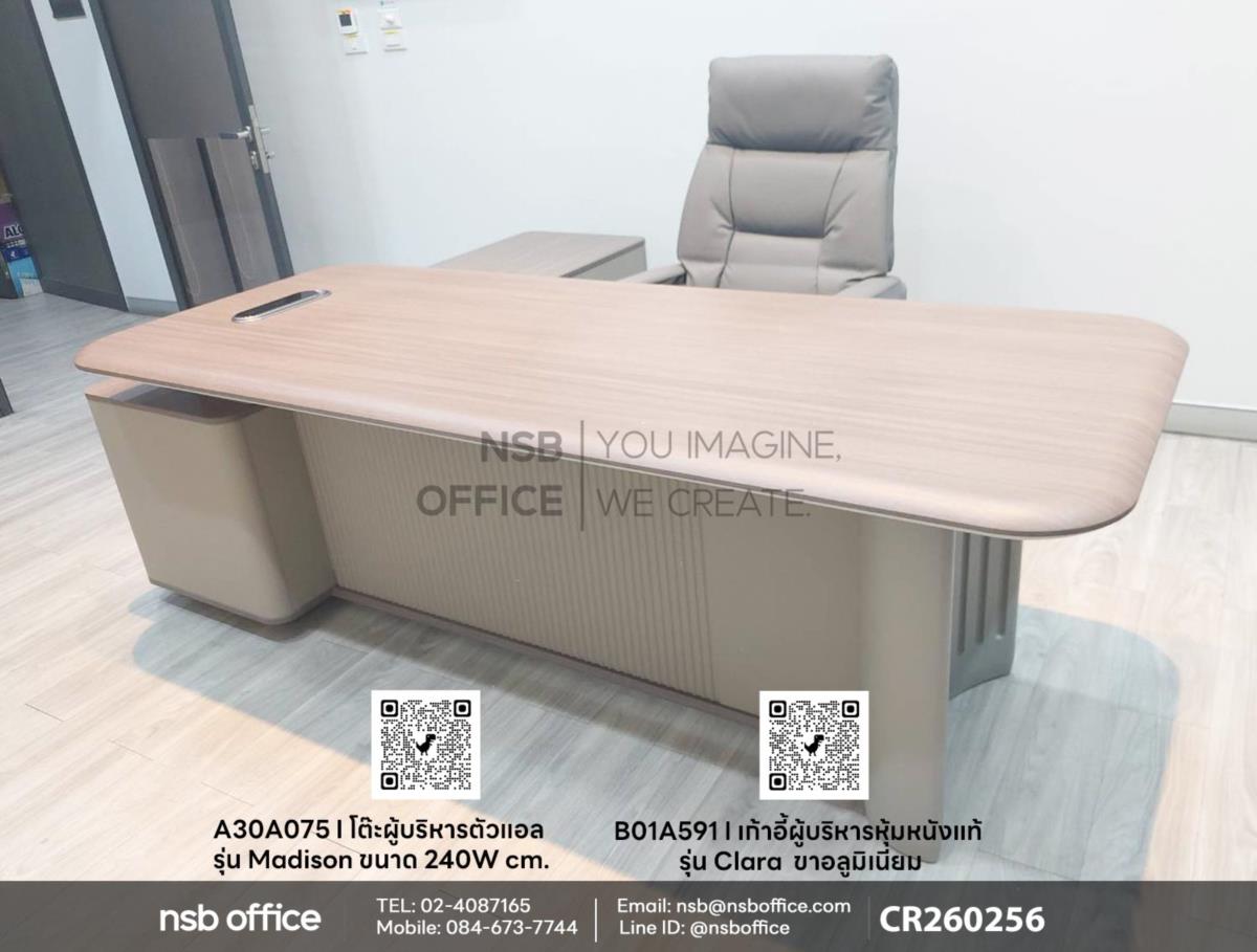 เพื่อเพิ่มความหรูหราและความสบายในการทำงานด้วยโต๊ะผู้บริหารตัวแอล รุ่น Madison (เมดิสัน) รหัสสินค้า A30A075 เสริมการใช้งานด้วยเก้าอี้ผู้บริหารหุ้มหนังแท้รุ่น Clara (คลาร่า) รหัสสินค้า B01A591 ด้วยดีไซน์ที่ทันสมัยและการออกแบบที่คำนึงถึงการใช้งานจริง โต๊ะนี้เหมาะสำหรับการทำงานที่ต้องการความสะดวกสบายและประสิทธิภาพสูงสุดค่ะ