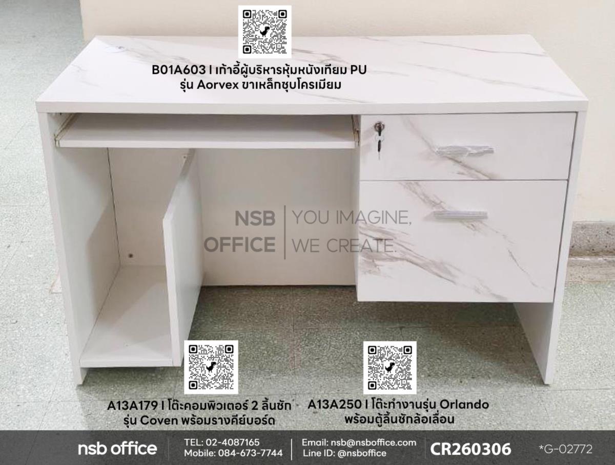 หากคุณกำลังมองหาโต๊ะทำงานที่ทั้งสวยงามและใช้งานได้จริง โต๊ะทำงานไม้เมลามีนรุ่น Coven (โคเวน) รหัสสินค้า A13A179 และรุ่น Orlando (ออร์แลนโด) รหัสสินค้า A13A250 คือคำตอบที่คุณไม่ควรพลาด! ด้วยวัสดุไม้เมลามีนที่มีความทนทานและดูแลรักษาง่าย โต๊ะนี้จึงเหมาะสำหรับการใช้งานในทุกสภาพแวดล้อม ไม่ว่าจะเป็นที่บ้านหรือที่ทำงาน รูปทรงเรียบง่ายแต่มีสไตล์ สามารถเข้ากับการตกแต่งในทุกแบบ ใช้งานคู่กับเก้าอี้ผู้บริหารหุ้มหนังเทียม PU รุ่น Aorvex (ออร์เวกซ์) รหัสสินค้า B01A603 ค่ะ