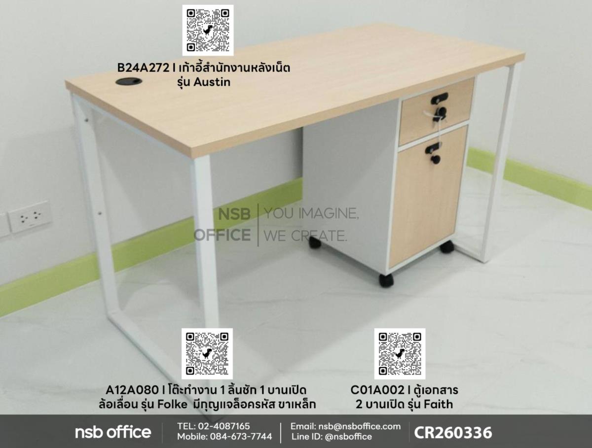 พบกับโต๊ะทำงานที่ออกแบบมาเพื่อความสะดวกสบายและการใช้งานที่หลากหลาย โต๊ะทำงาน 1 ลิ้นชัก 1 บานเปิดรุ่น Folke (โฟล์ก) รหัสสินค้า A12A080 นี้เหมาะสำหรับการจัดเก็บเอกสารและอุปกรณ์สำนักงานอย่างเป็นระเบียบ พร้อมให้คุณทำงานได้อย่างมีประสิทธิภาพใช้งานคู่กับเก้าอี้สำนักงานหลังเน็ต รุ่น Austin (ออสติน) รหัสสินค้า B24A272 เพื่อความสบายในการนั่งทำงานตลอดวัน เก้าอี้สำนักงานหลังเน็ตจะช่วยให้คุณรู้สึกผ่อนคลายและไม่เมื่อยล้า ด้วยการออกแบบที่ทันสมัยและรองรับสรีระของผู้ใช้ เสริมการใช้งานด้วย ตู้เอกสาร 2 บานเปิดรุ่น Faith (เฟธ) รหัสสินค้า C01A002 ช่วยให้คุณจัดเก็บเอกสารสำคัญได้อย่างเป็นระเบียบและเข้าถึงได้ง่าย ไม่ว่าจะเป็นเอกสารทางการหรือเอกสารส่วนตัว ตู้เอกสารนี้จะช่วยให้พื้นที่ทำงานของคุณดูเรียบร้อยและมีสไตล์ค่ะ