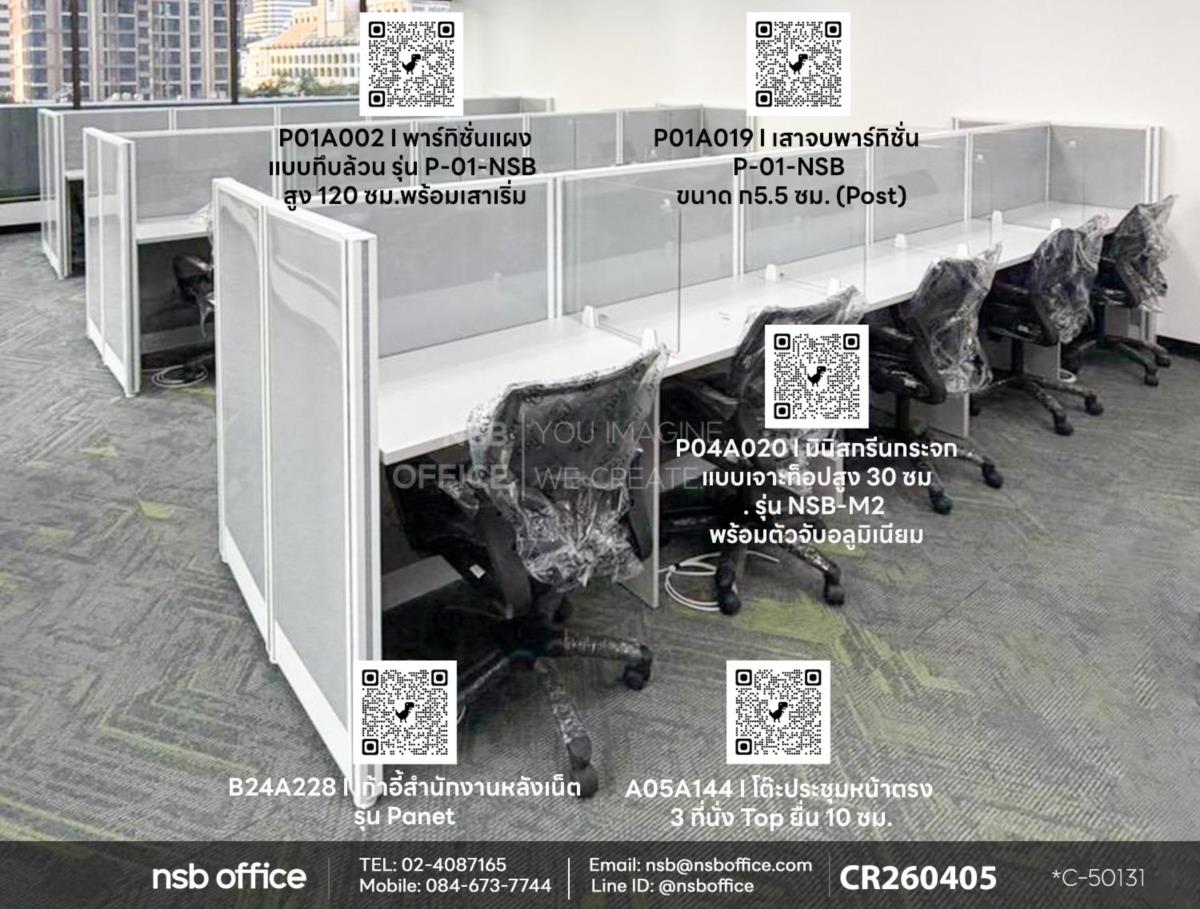 สำหรับหน้างานนี้เป็นโซนสำนักงาน ลูกค้าได้เลือกซื้อพาร์ทิชั่นรุ่น P-01-NSB รหัสสินค้า P01A002 และมินิสกรีนกระจก รหัสสินค้า P04A020 สีเทาอ่อน (P17) ไปใช้เพิ่มความเป็นส่วนตัวของสำนักงานให้ดูเป็นสัดส่วนในการนั่งทำงานมากขึ้น เสริมการใช้งานด้วยเก้าอี้สำนักงานหลังเน็ต รุ่น Panet (แพนิต) รหัสสินค้า B24A228 เข้ากับทุกสไตล์การตกแต่ง ไม่ว่าจะเป็นที่บ้านหรือในสำนักงาน พาร์ทิชั่นรุ่นนี้จะเพิ่มสมาธิในการทำงาน และช่วยลดเสียงรบกวนและสร้างบรรยากาศที่เหมาะสมสำหรับการทำงานได้ดีอีกด้วยค่ะ